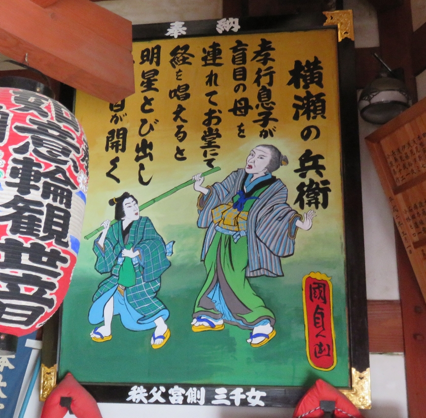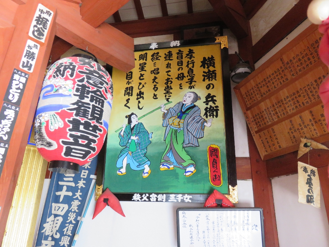 明智寺の本堂の六角形の観音堂の納額・・・納額には下に「秩父宮側 三千女」と書かれている。1988年から25年かけて描き、34札所すべてに秩父市宮側町の「浅賀ちょうちん店」の浅賀三千子さんが奉納した額との事です(2024/6/8) |