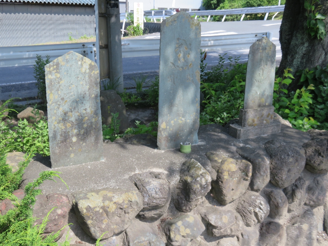 明智寺の入口の脇にある三基の青色塔婆(2024/6/8) |