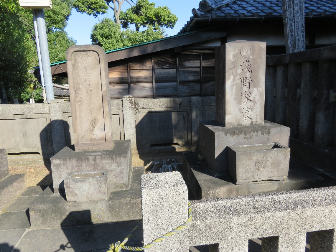 泉岳寺の浅野家の墓・・・・・ 浅野内匠頭長矩の実弟の浅野長広(浅野大学)から、長楽まで浅野長広(浅野大学)家の歴代の墓がある。(2019/11/21) |