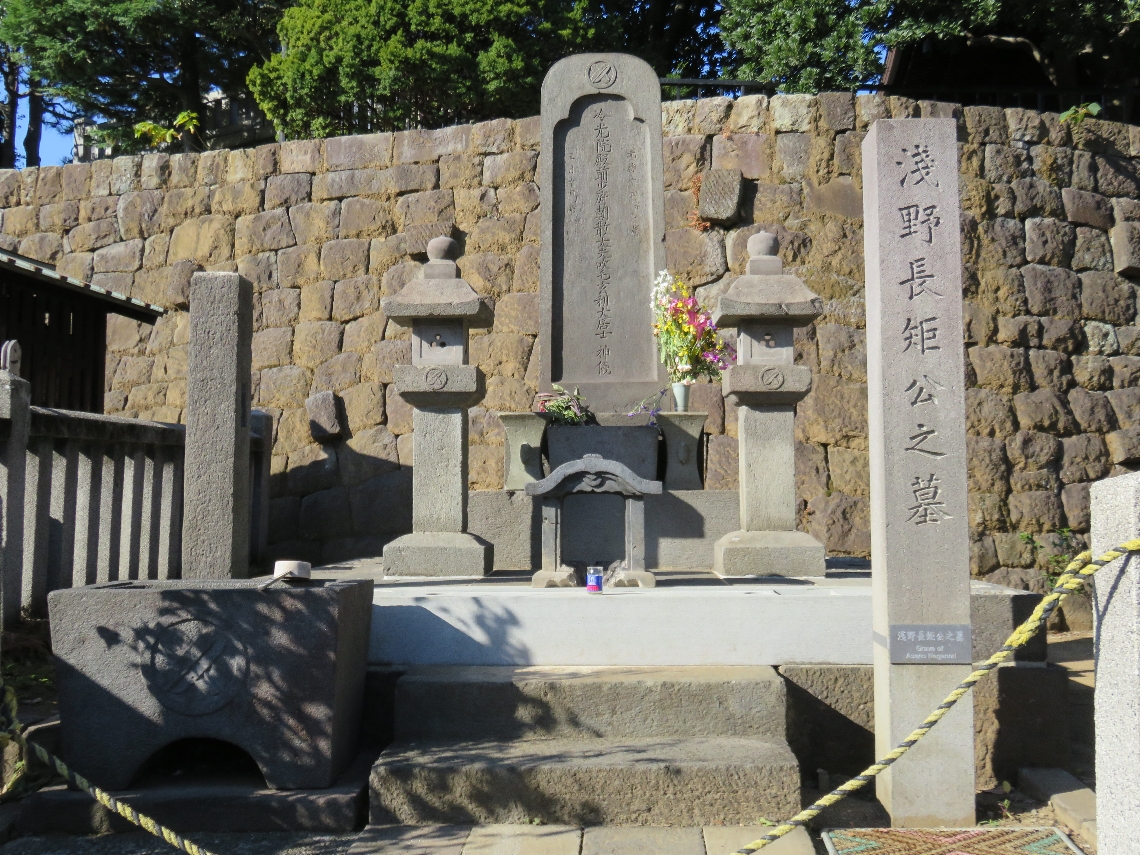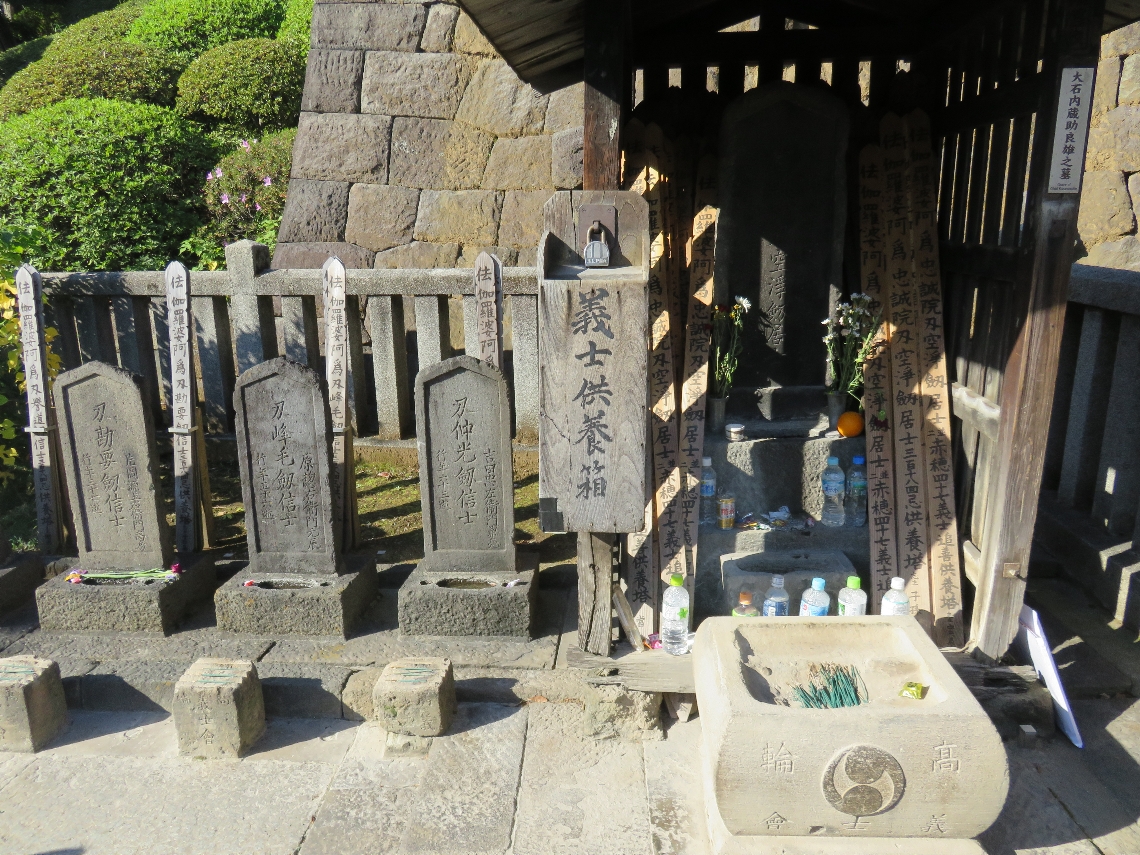 ●泉岳寺(せんがくじ)・・・・・東京都港区高輪二丁目にある曹洞宗の寺院慶長17年(1612年)に徳徳川家家康が外桜田(桜田門周辺)の地に門庵宗関を招いて創建した寺院。寛永18年(1641年)の寛永の大火で焼失したが、徳川家光の命で、長府毛利・笠間浅野・鹿沼朽木・丹羽・水谷の5大名により、現在の高輪の地で再建された。御手伝普請の大名は菩提寺とする事で徳川への忠誠を示す。元禄14年(1701年)3月、松の廊下の刃傷により切腹した浅野長矩が、次いで元禄16年(1703年)2月、元禄赤穂事件で赤穂義士が葬られた。