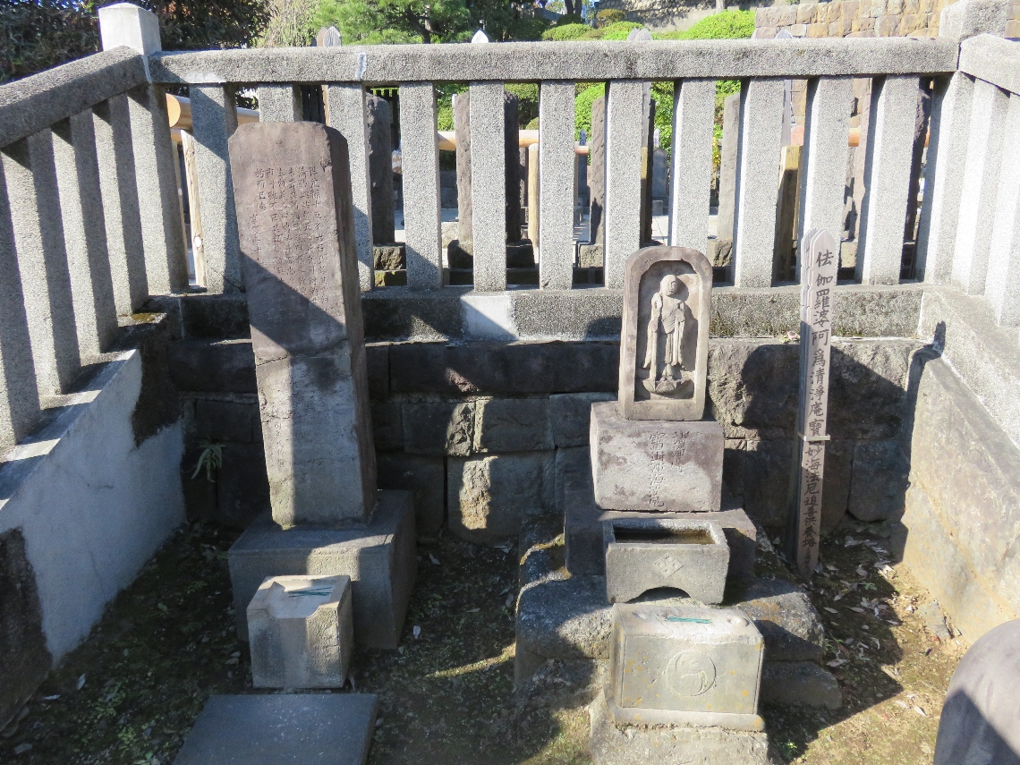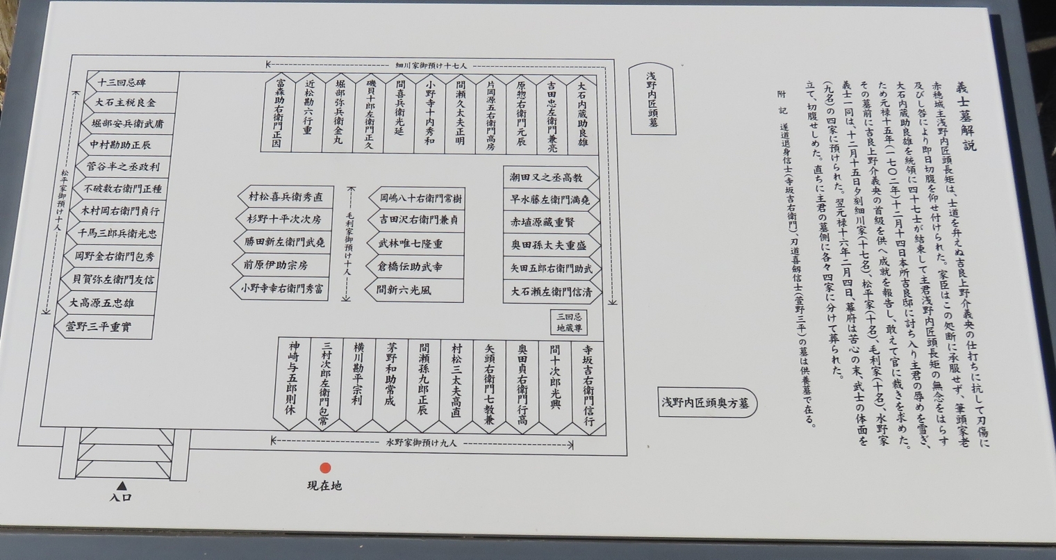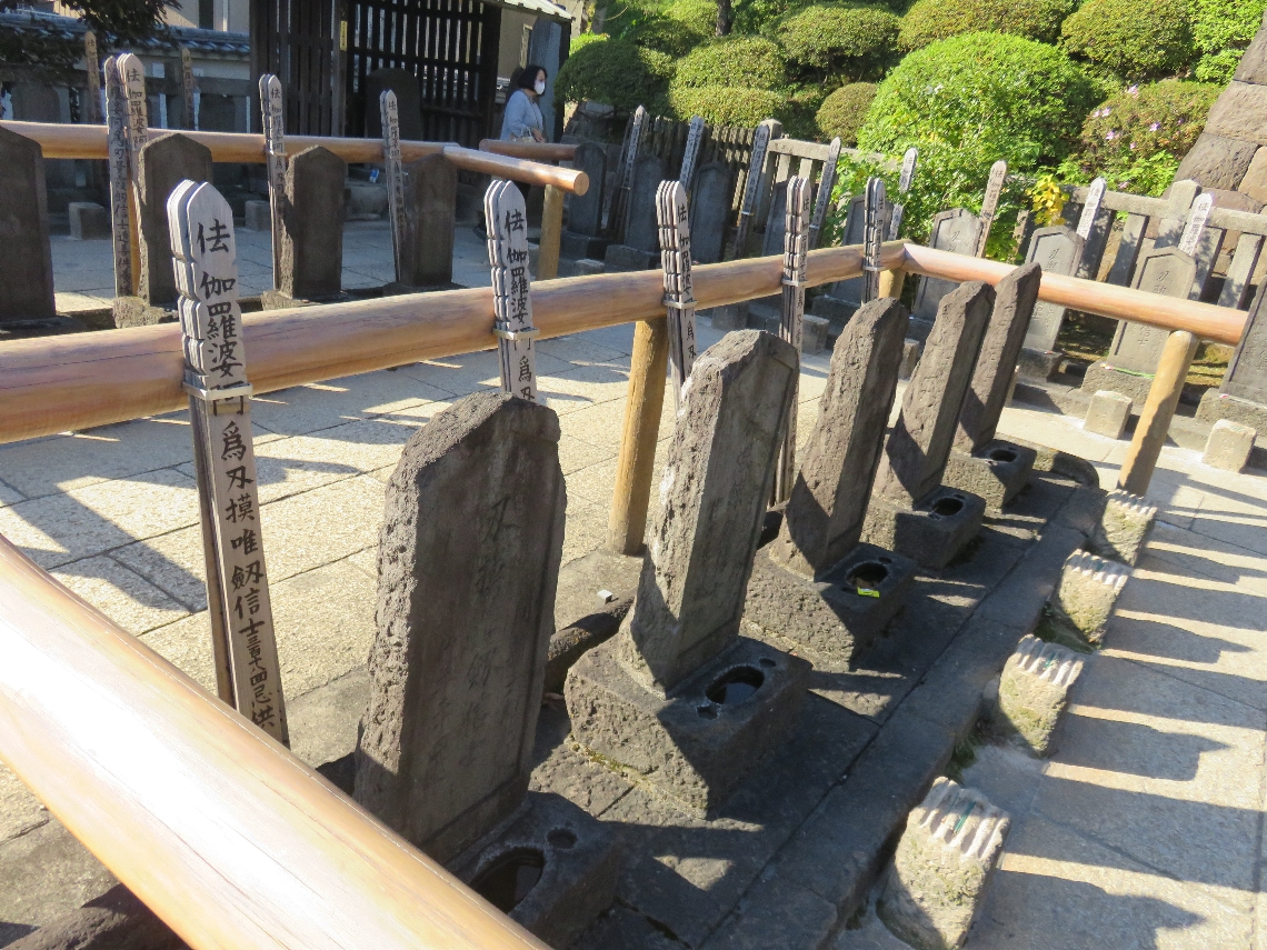 ●浅野長矩墓および赤穂義士墓・・・・・元禄14年3月14日江戸城中で吉良義央(上野介)に対し刃傷沙汰に及び、即日切腹となった赤穂藩主浅野長矩(内匠頭)の墓、及び、元禄15年12月14日、江戸本所の吉良屋敷に押し入って吉良の首級を上げ、翌年2月4日に切腹となったいわゆる赤穂浪士(泉岳寺では「赤穂義士」と呼んでいる)の墓である。一般に赤穂浪士は「四十七士」と呼ばれるが、泉岳寺の赤穂義士墓地には、本人は討ち入りを熱望したものの周囲の反対に遭い討ち入り前に切腹した萱野三平重実の供養墓「明和4年(1767年)9月建立」を含め48基の墓塔がある。48基のうち、萱野三平と、遺骸を遺族が引き取ったため泉岳寺には埋葬されていない間光風(新六)、討入りに参加した浪士の中で唯一人切腹をまぬがれた寺坂信行(吉右衛門)の墓塔は、遺骸の埋葬を伴わない供養塔である。なお寺坂以外の浪士の戒名はすべて最初の文字が「刃」となっている。(フリー百科事典ウィキペディアより)