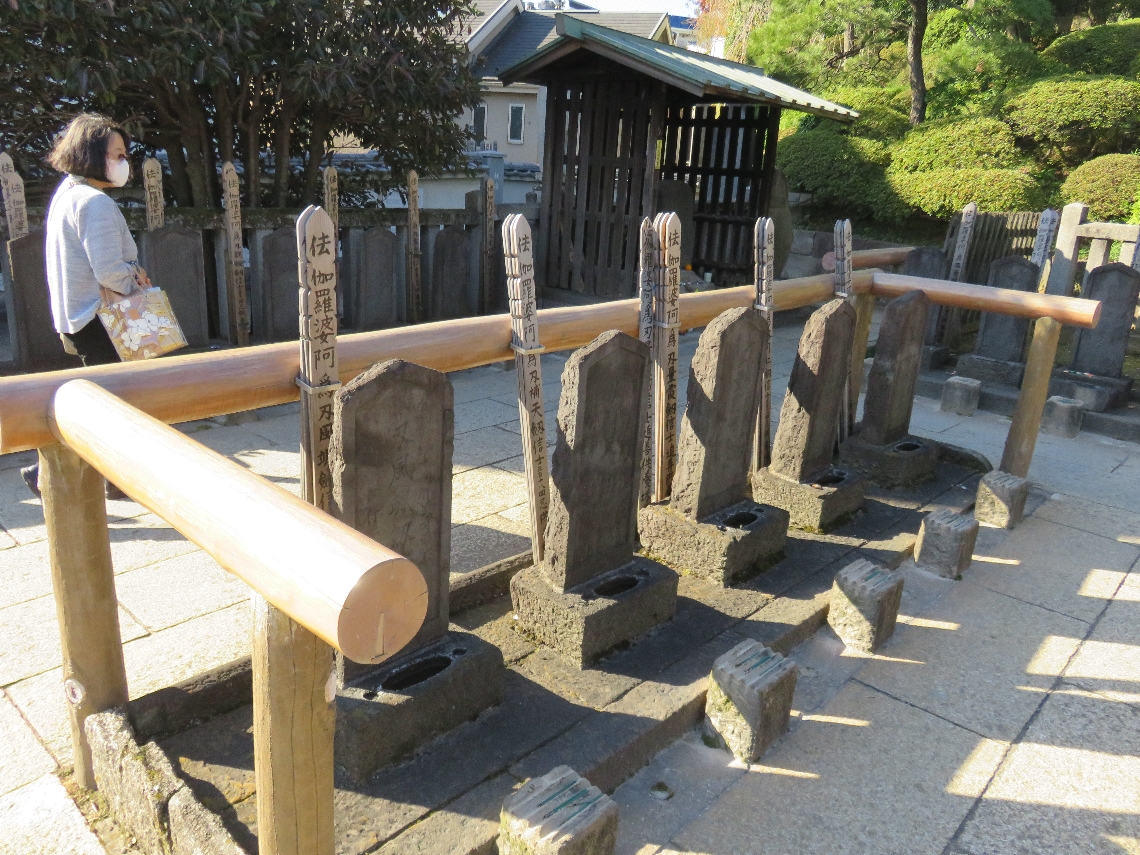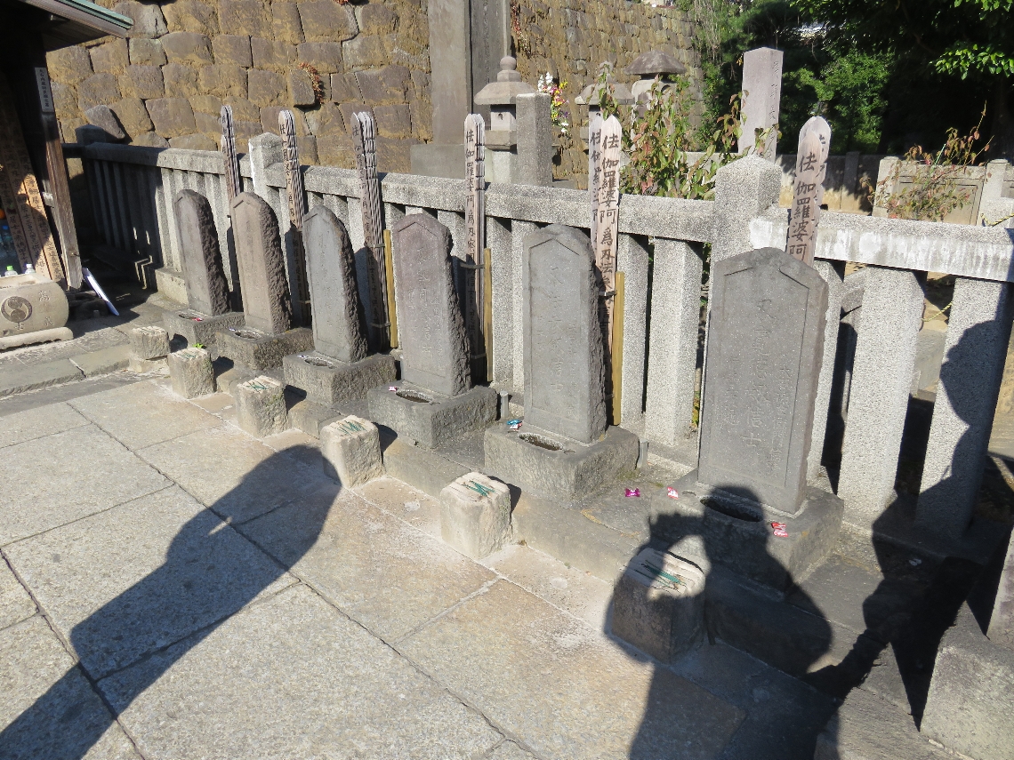 泉岳寺の赤穂義士の墓・・・4列の一番右は吉田忠左衛門兼亮の墓でその左は原惣右衛門元辰の墓でその左は片岡源五右衛門高房の墓でその左は間瀬久太夫正明の墓(2019/11/21) |