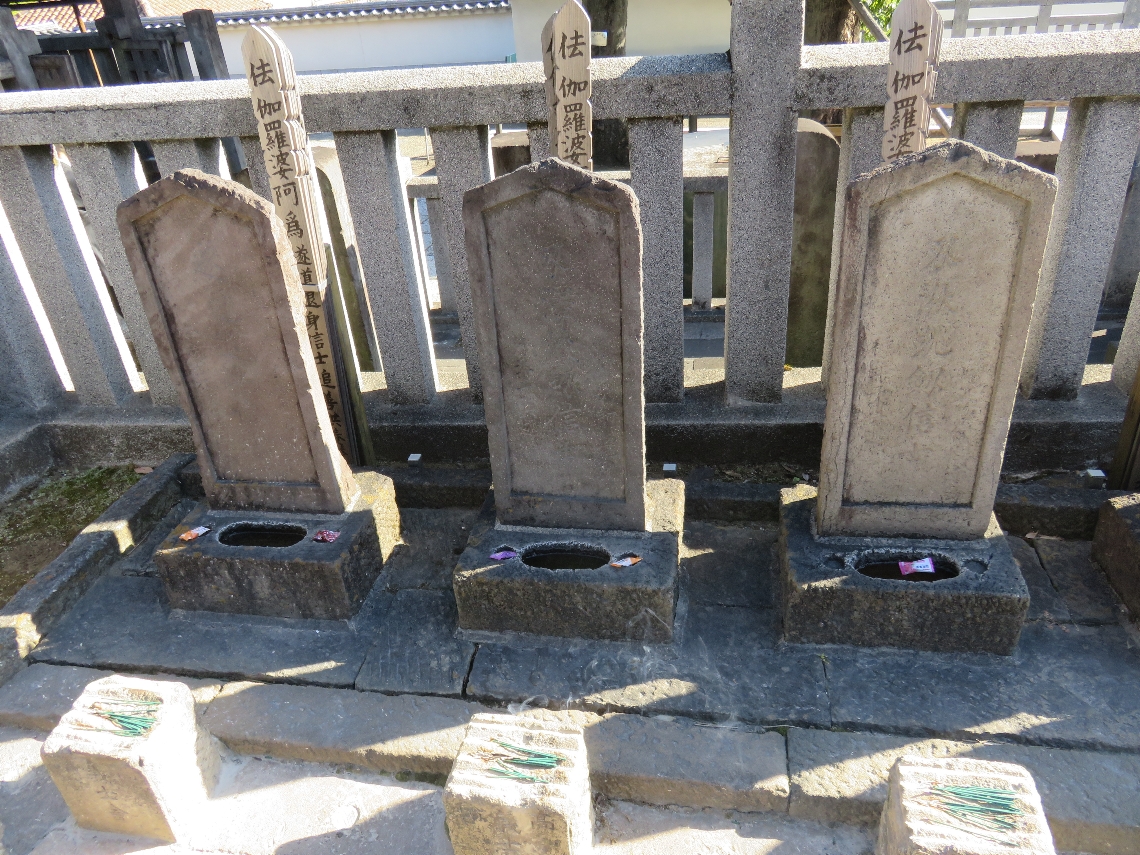 泉岳寺の大石内蔵助良雄の墓と墓の囲いの左は吉田忠左衛門兼亮の墓でその左は原惣右衛門元辰の墓でその左は片岡源五右衛門高房の墓(2019/11/21) |