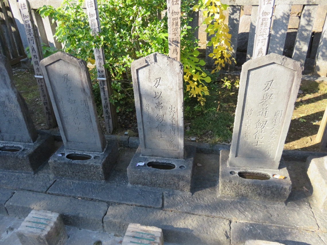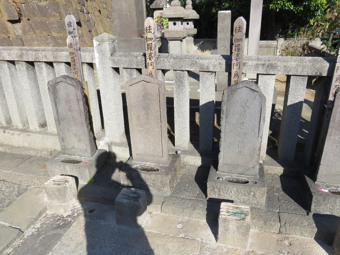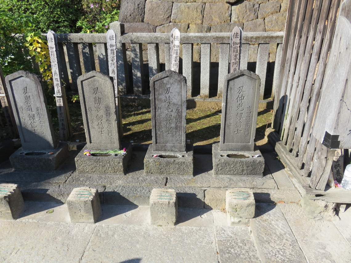 泉岳寺の赤穂義士の墓で3列の一番右は赤埴源蔵重賢の墓でその左は早水藤左衛門満堯の墓でその左は潮田又之丞高教の墓(2019/11/21) |