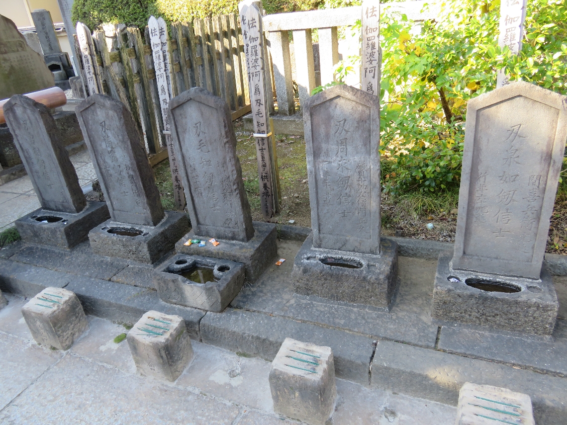 泉岳寺の赤穂義士の墓で3列の一番右は奥田貞右衛門行高の墓でその左は間十次郎光興の墓でその左は寺坂吉右衛門信行の墓・・・・・寺坂吉右衛門信行は本懐成就後、搖泉院など関係者に討ち入りを報告して廻り、のちに江戸に戻って自首しましたが赦され、麻布・曹渓寺で83歳の天寿を全うしました。現在も曹渓寺に眠っています。この寺坂の墓は慶応4年(明治元年・1868年)6月に供養のために建てられた遺骸の伴わない供養塔です。(2019/11/21) |
