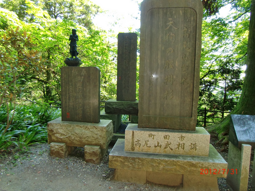 高尾山の天狗の腰掛け杉の石碑と善儞師(ぜんにし)童子像(2012/7/31) |