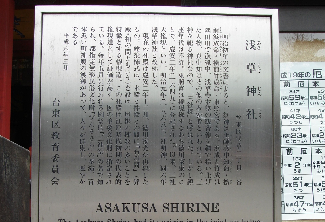 ●浅草神社の祭神・・・・・浅草寺の創建に関わった土師真中知(はじのまなかち)、檜前浜成(ひのくまのはまなり)、檜前竹成(ひのくまのたけなり)を主祭神とし、東照宮(徳川家康)・大国主命を合祀する。