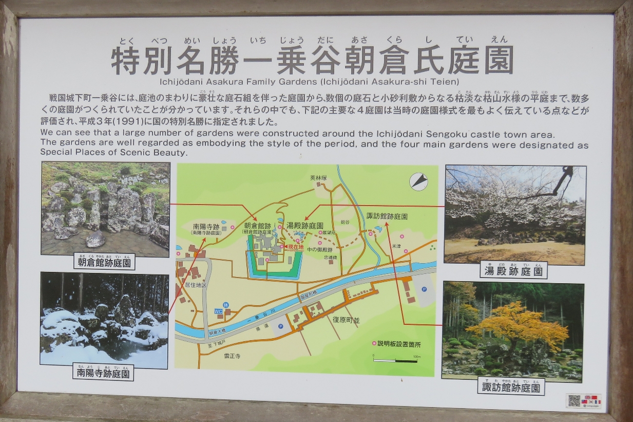 一乗谷朝倉氏遺跡の朝倉館跡にある朝倉氏庭園の案内板(2025/5/30) |