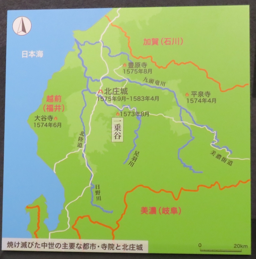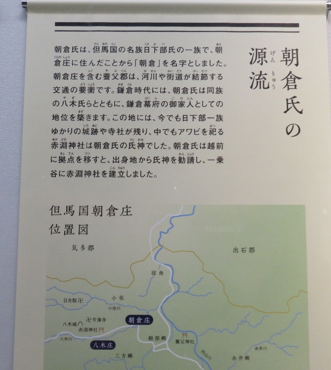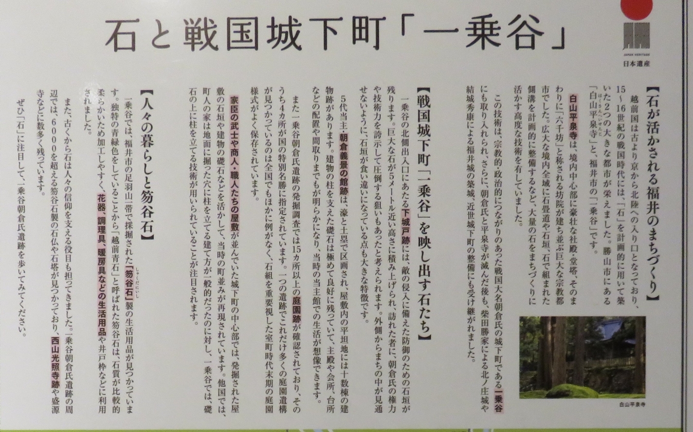 ●朝倉氏と遺跡の沿革・・・・・朝倉氏は現在の兵庫県養父(やぶ)市出身の豪族で、南北朝時代に朝倉広景が主人の斯波高経(しばたかつね)に従って越前に入国しました。朝倉孝景の代、1467年の応仁の乱での活躍をきっかけに一乗谷に本拠地を移し、斯波氏、甲斐(かい)氏を追放して越前国(えちぜんのくに)を平定しました。以後孝景(たかかげ)、氏景(うじかげ)、貞景(さだかげ)、孝景(たかかげ)、義景(よしかげ)と5代103年間にわたって越前国の中心として繁栄し、この間、京都や奈良の貴族・僧侶などの文化人が訪れ、北陸の小京都とも呼ばれました。しかし天下統一の戦いの中で1573年織田信長に敗れ、朝倉氏は滅び、城下町も焼き尽くされました。(福井市文化遺産HPより)