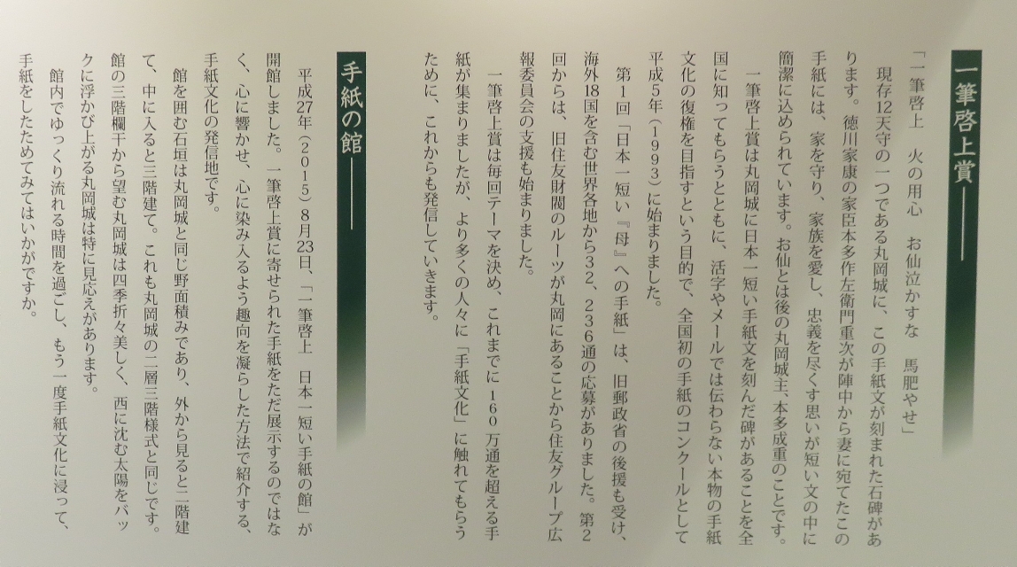 ●一筆啓上 日本一短い手紙の館・・・・・〒910-0231 福井県坂井市丸岡町霞町3-10-1。丸岡城のすぐそばにあり、古城展望室のフロアーは、丸岡城天守閣の3階とほぼ同じ面積になっており、欄干からは丸岡城下を一望することができます。普通では見ることのできない上空からの丸岡城や坂井市内の四季折々の美しい映像も見られます。