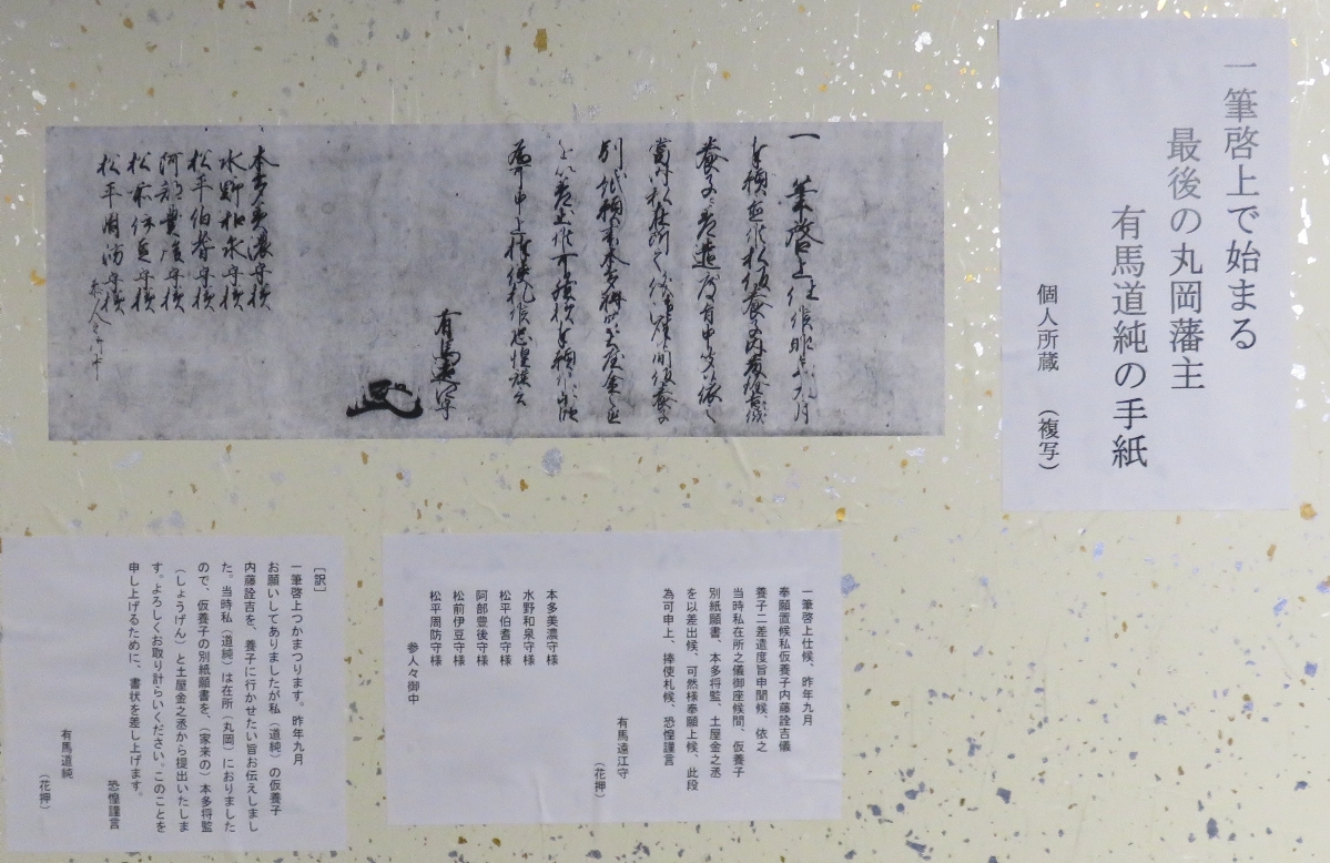 ●この館について・・・・・徳川家康の功臣で鬼作左の勇名をとどろかせた本多作左衛門重次が陣中から妻にあてた手紙文(一筆啓上 火の用心 お仙泣かすな 馬肥やせ)は用件を簡潔明瞭に伝えた手紙の手本と言われています。簡潔明瞭な中にも妻や子を気遣う優しさが短い文の中に伺うことができます。手紙で家族の安否を気遣うことは昔も今も変わりがありません。この手紙文の中に出てくる「お仙」とは、後の丸岡藩主、本多成重のことで、幼名を仙千代といいました。