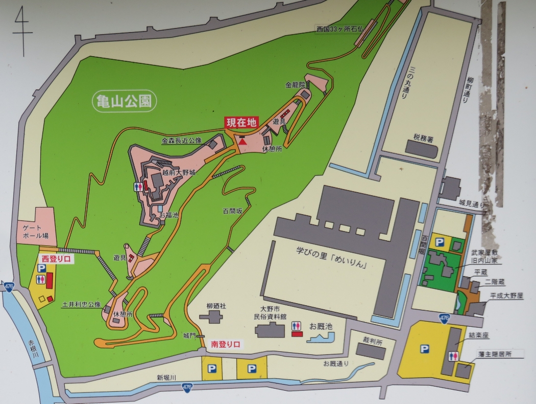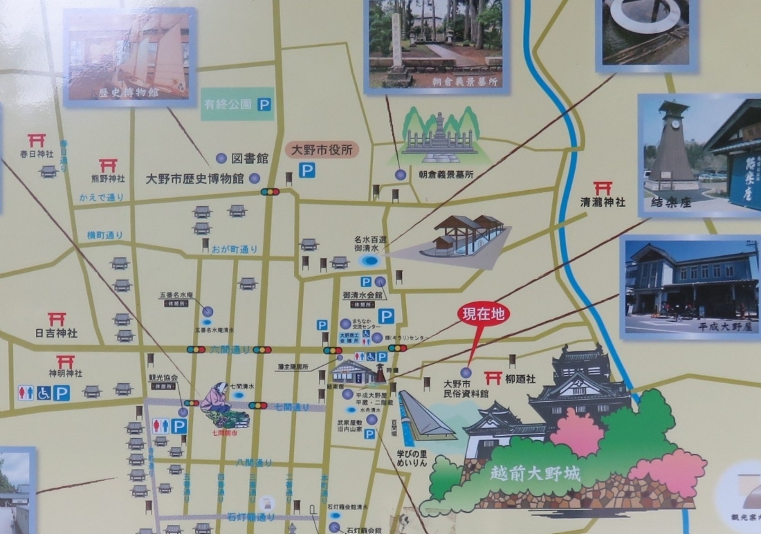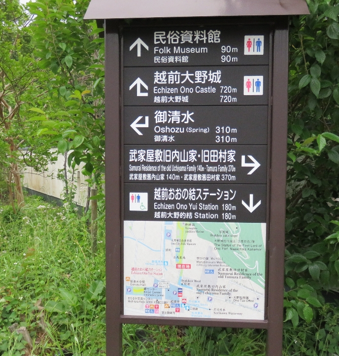 越前大野城のふもとの大野市民俗資料館のそばの観光案内板(2025/5/31) |