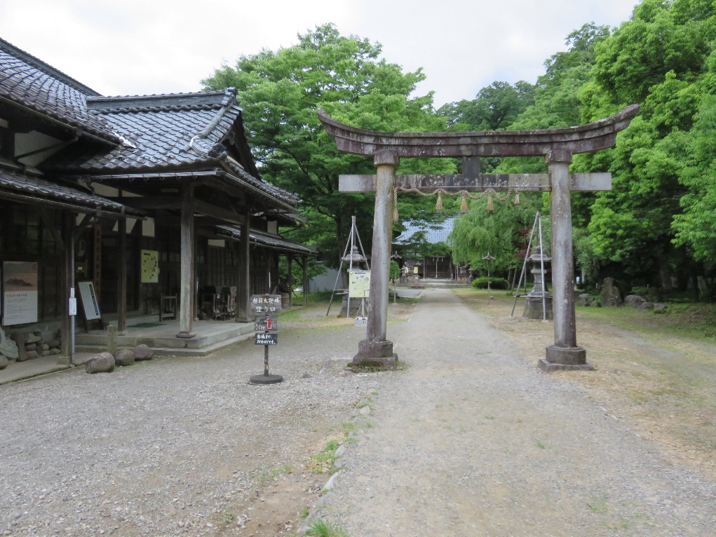 越前大野城のふもとの登り口にある左側は大野市民俗資料館で鳥居のまっすぐ先は柳廼社(2025/5/31) |