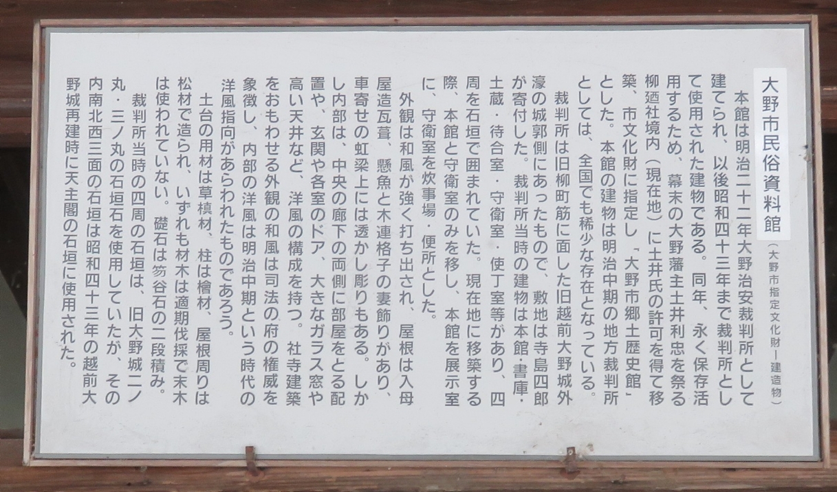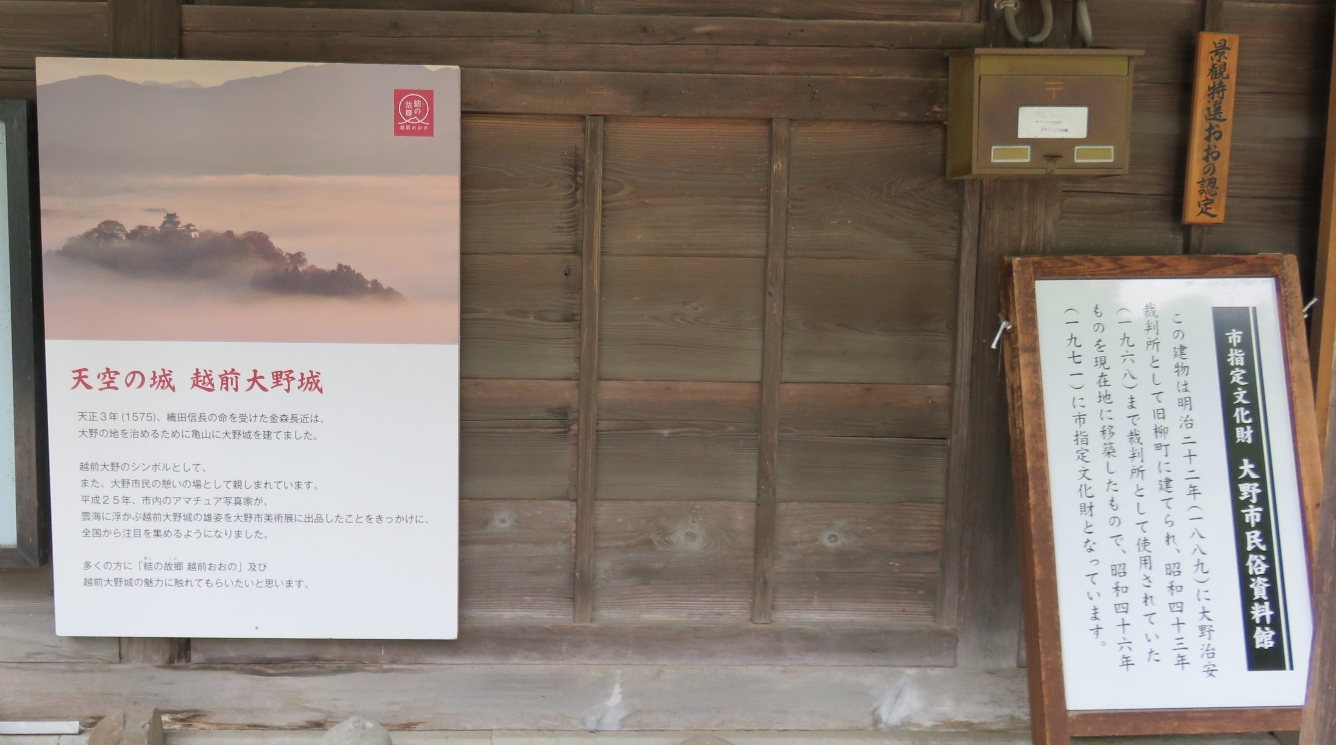 越前大野城の登り口にある大野市民俗資料館の説明版(2025/5/31) |