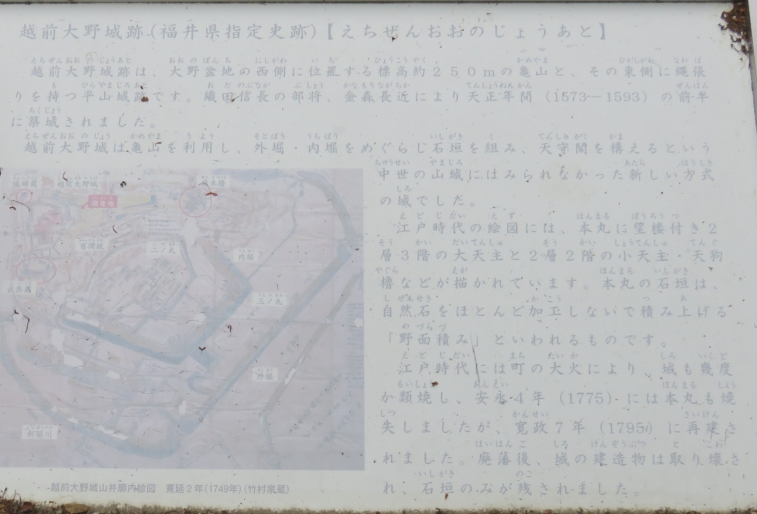 越前大野城の天守閣前の古びた説明版(2025/5/31) |