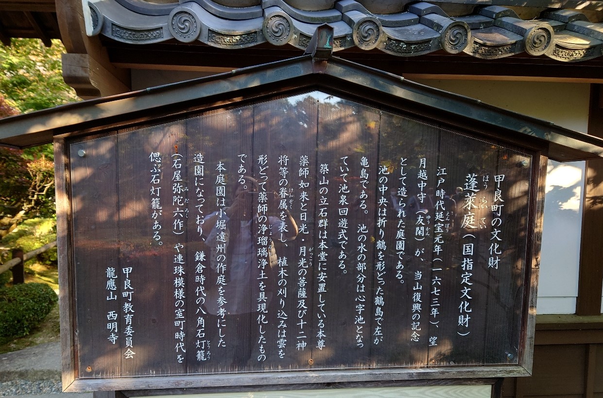 | 西明寺の名勝庭園(蓬莱庭)の説明版(2022/10/26) | |