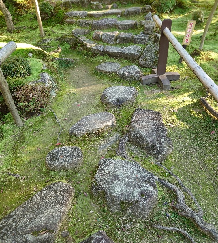| 西明寺の名勝庭園(蓬莱庭)の石段をあがってゆくと築山になる(2022/10/26) | |