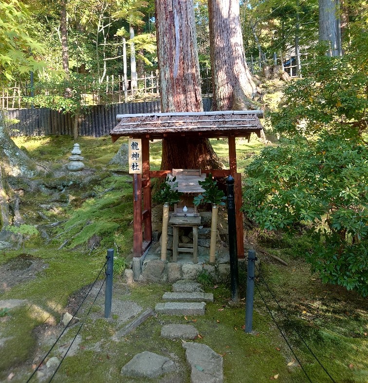 | 西明寺の名勝庭園(蓬莱庭)の石段をあがってゆくと築山になり、歩いてゆくと龍神社(水を司る神様)がある(2022/10/26) | |