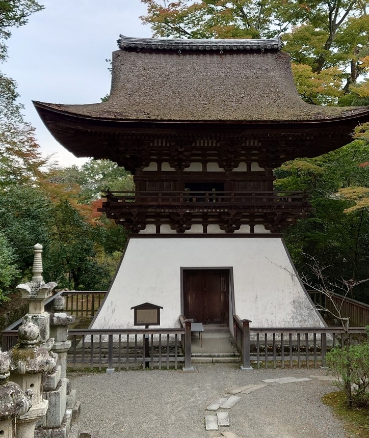石山寺の硅灰石の奥の鐘楼と本堂下の御影堂(2022/10/27) |
