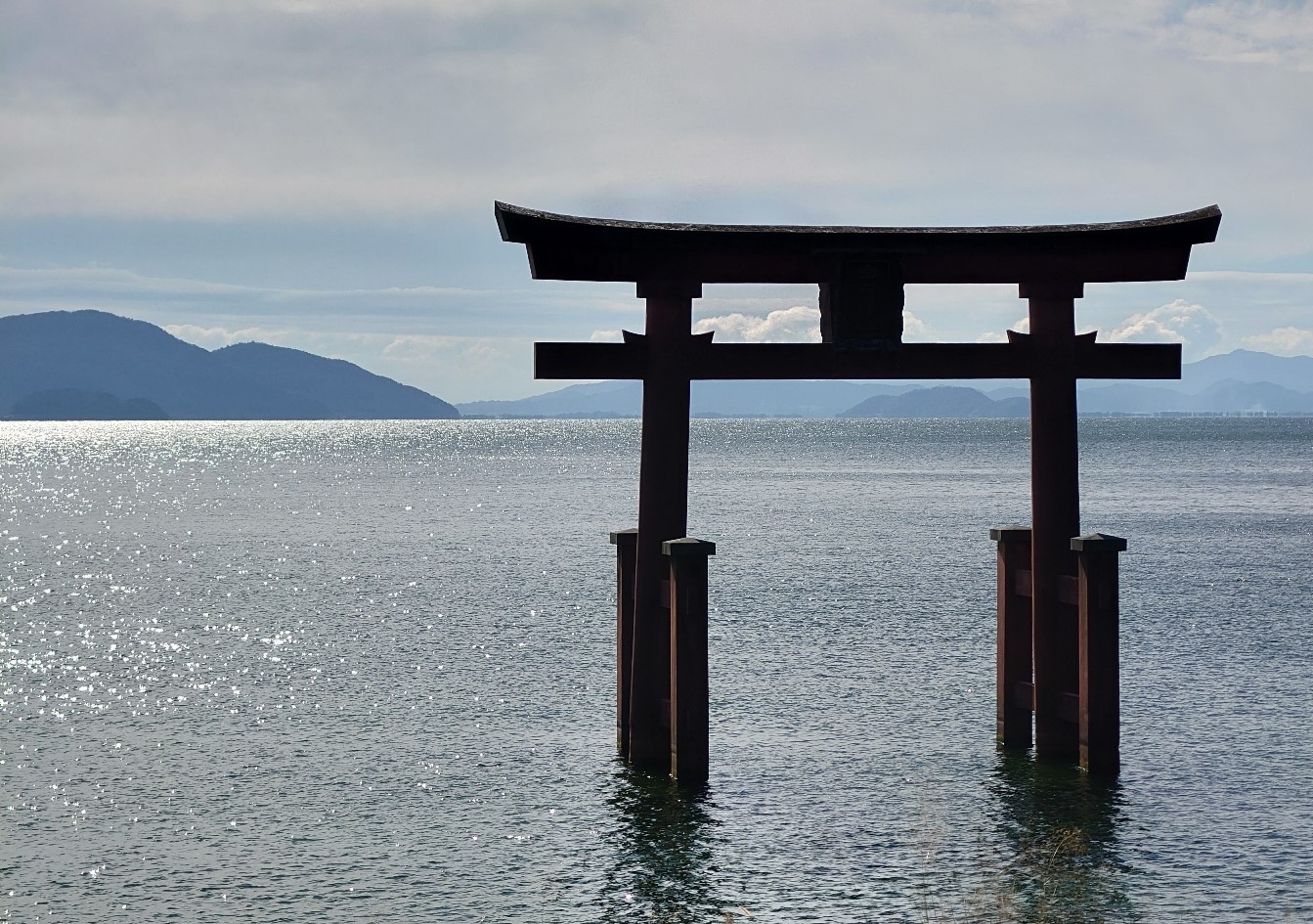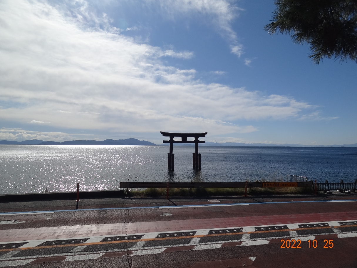 ●湖中大鳥居・・・大昔から白鬚明神前の湖中には鳥居があったと伝えられ、室町時代の屏風絵「近江名所図」や、江戸時代に描かれた当社の縁起絵巻にも湖中の鳥居が描かれている。>鳥居が湖中に建つ理由は諸説あるが、実際にあったという証拠もない。古来波打ち際に鳥居が見え隠れしていたとも、天下異変の前兆として社前の湖中に石橋や鳥居が突然姿を現したとも言われる伝説の鳥居である。