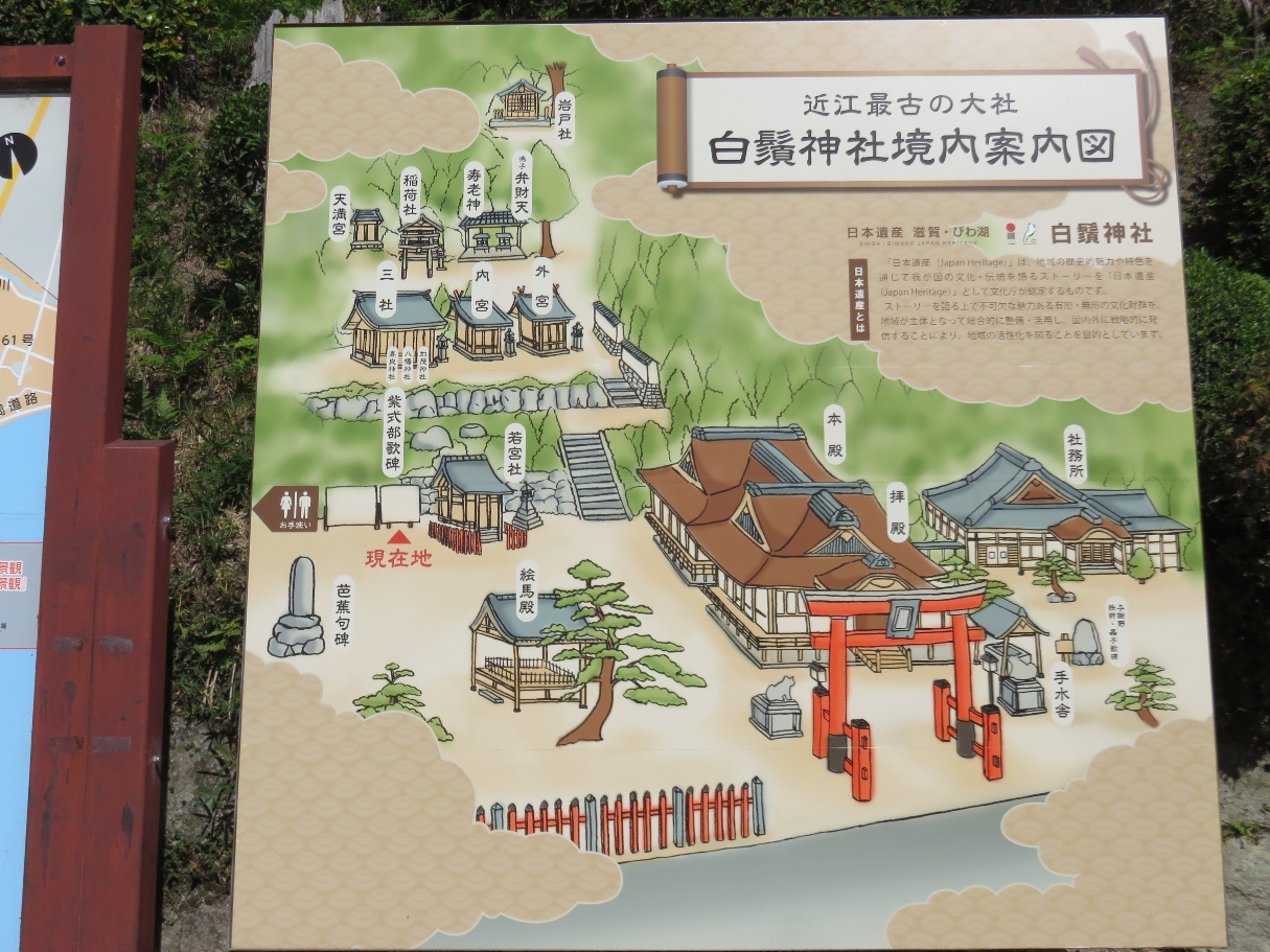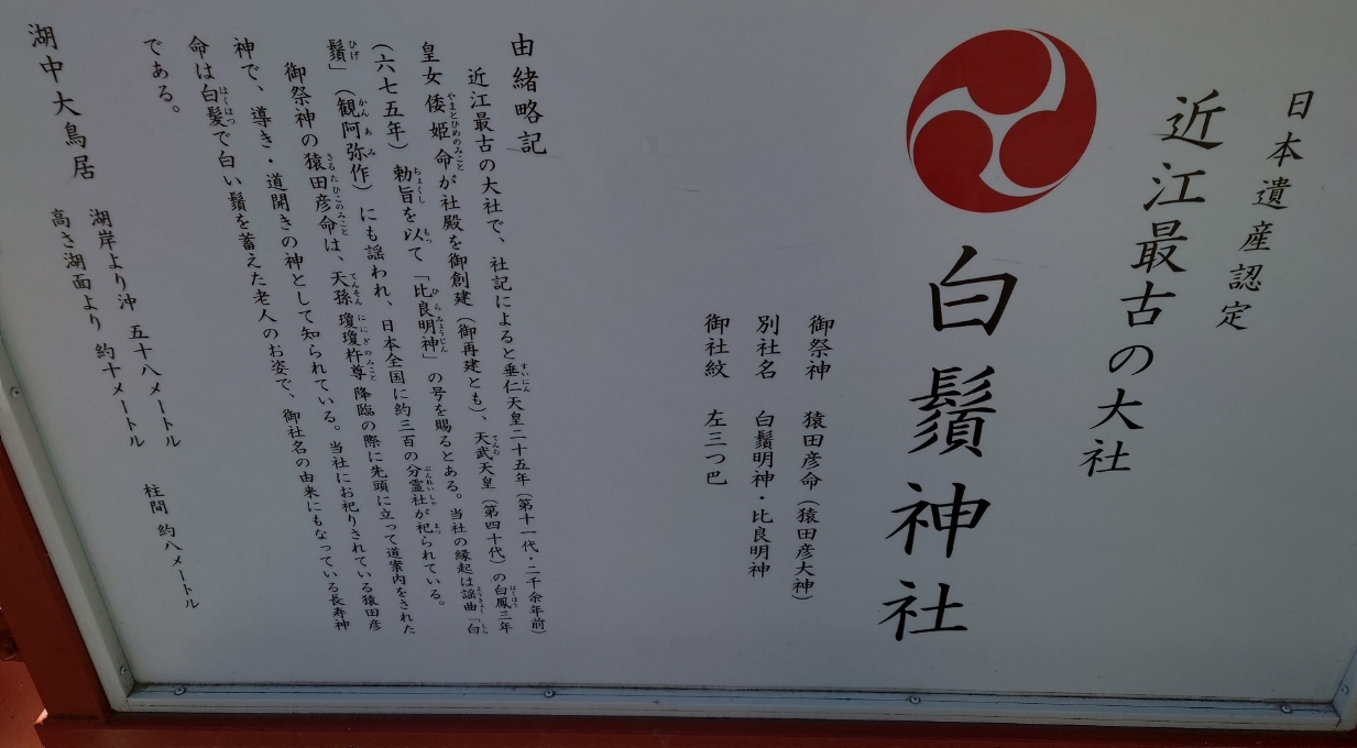 ●白髭神社(しらひげじんじゃ)・・・滋賀県高島市鵜川215。由緒略記・・・近江最古の大社で、社記によると垂仁(すいにん)>天皇の25年(第11代・2000余年前)、皇女倭姫命>(>やまとひめのみこと)が社殿を御創建(御再建とも)、天武(てんむ)天皇(第40>代)の白鳳(はくほう)3年(675)勅旨(ちょくし)を以て「比良明神(ひらみょうじん)」の号を賜るとある。当社の縁起(えんぎ)は謡曲(ようきよく)「白鬚」観阿弥(かんあみ)作にも謡われ、日本全国に約300の分霊社(ぶんれいしや)が祀(まつ)られている。御祭神の猿田彦命(さるたひこのみこと)は、天孫(てんそん)