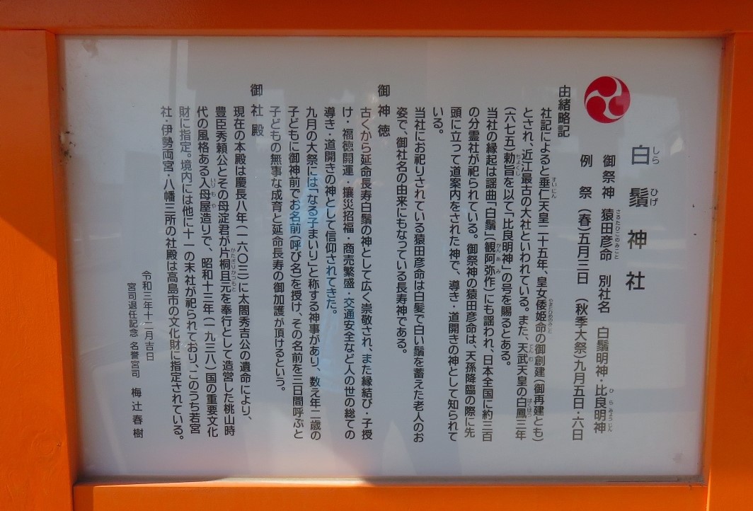 瓊瓊杵尊(ににぎのみこと) 降臨(こうりん)の際に先頭に立って道案内をされた神で、導き・道開きの神として知られている。当社にお祀りされている猿田彦命は白髪で白い鬚を蓄えた老人のお姿で、御社名の由来にもなっている長寿神である。(白髭神社HPより)