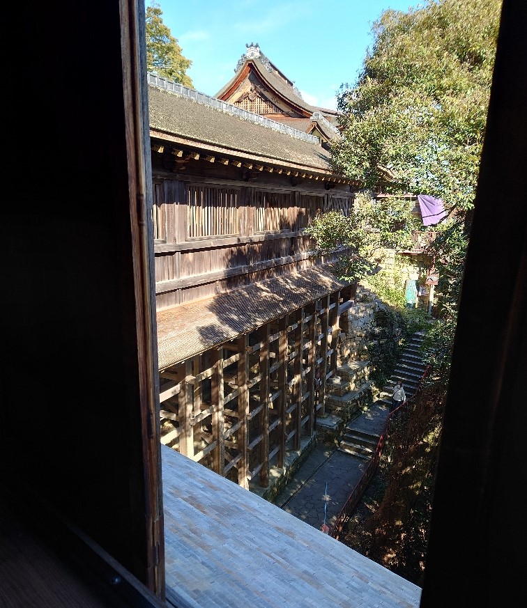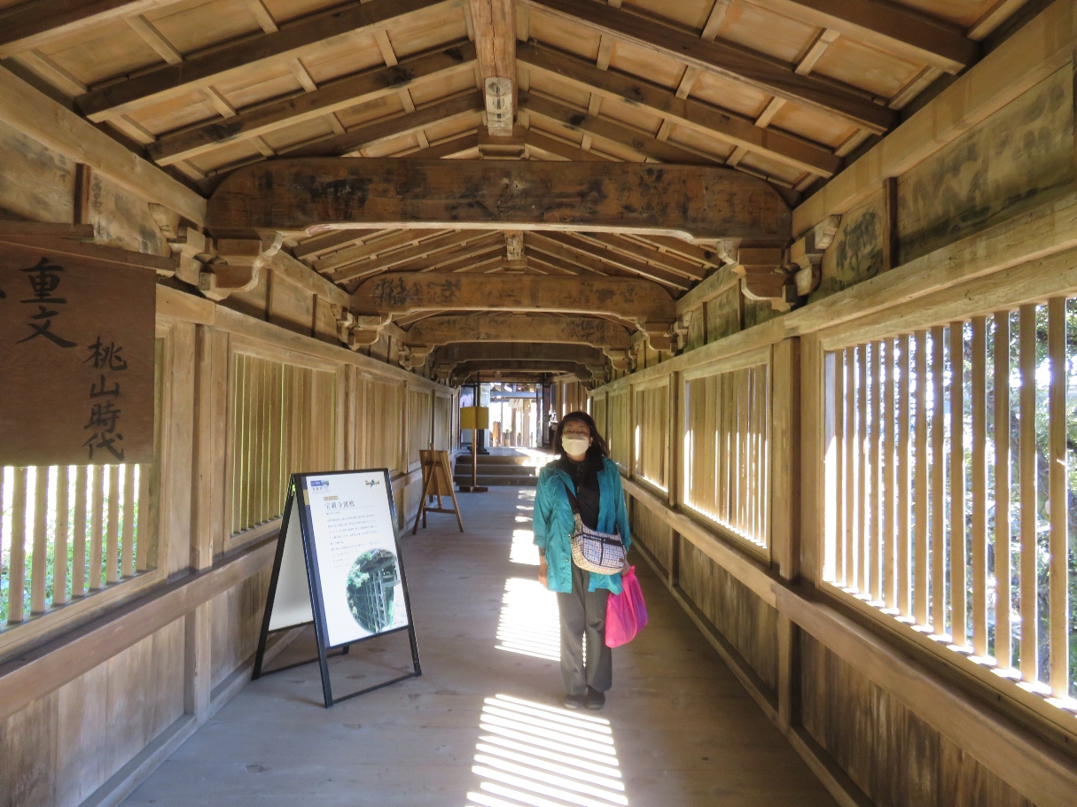 ●宝厳寺の観音堂・・・観音堂は唐門の裏に繋がる正面5間、側面4間の建物で、檜皮葺、重要文化財に指定されている。「清水の舞台」のように、崖より建物が突出し、床を柱と貫(ぬき)で支えた懸造(かけづく)りとなっている。唐門との意匠の統一性が見られる所から、慶長7年(1602)から翌年にかけて、唐門と同時に豊国廟から移築されたものと考えられる。