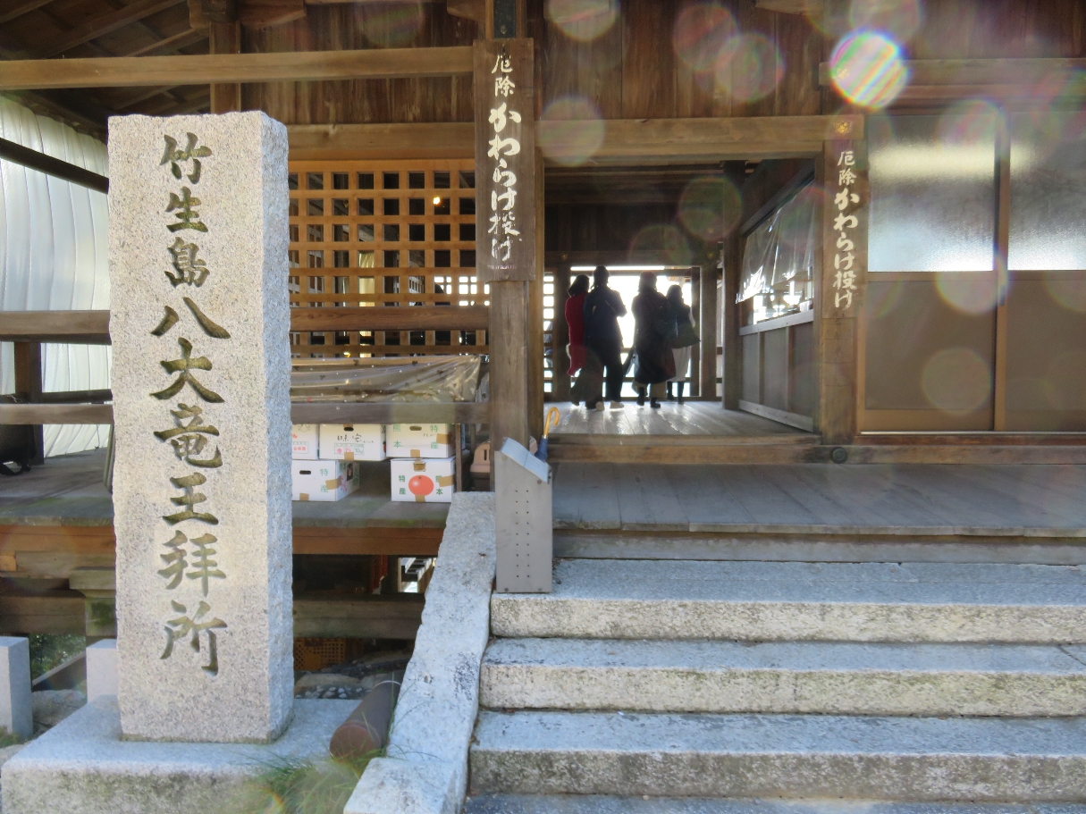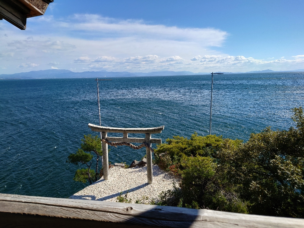 竹生島の八大竜王拝所。拝所では下の宮崎鳥居に向かってのかわらけ投げが人気のようです。見事かわらけが鳥居をくぐると願いが叶うと言われています。(2022/10/25) |