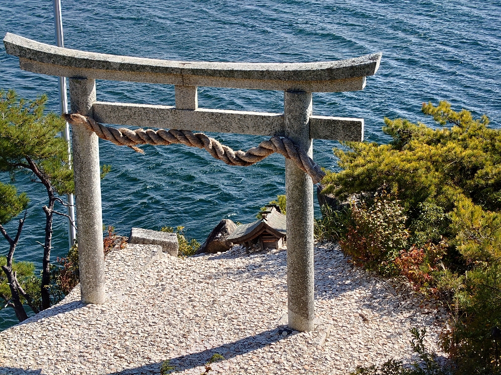 竹生島の八大竜王拝所の下の宮崎鳥居(ここに向かって願い事を書いたかわらけを投げるが人気のようです。見事かわらけが鳥居をくぐると願いが叶うと言われています。)(2022/10/25) |