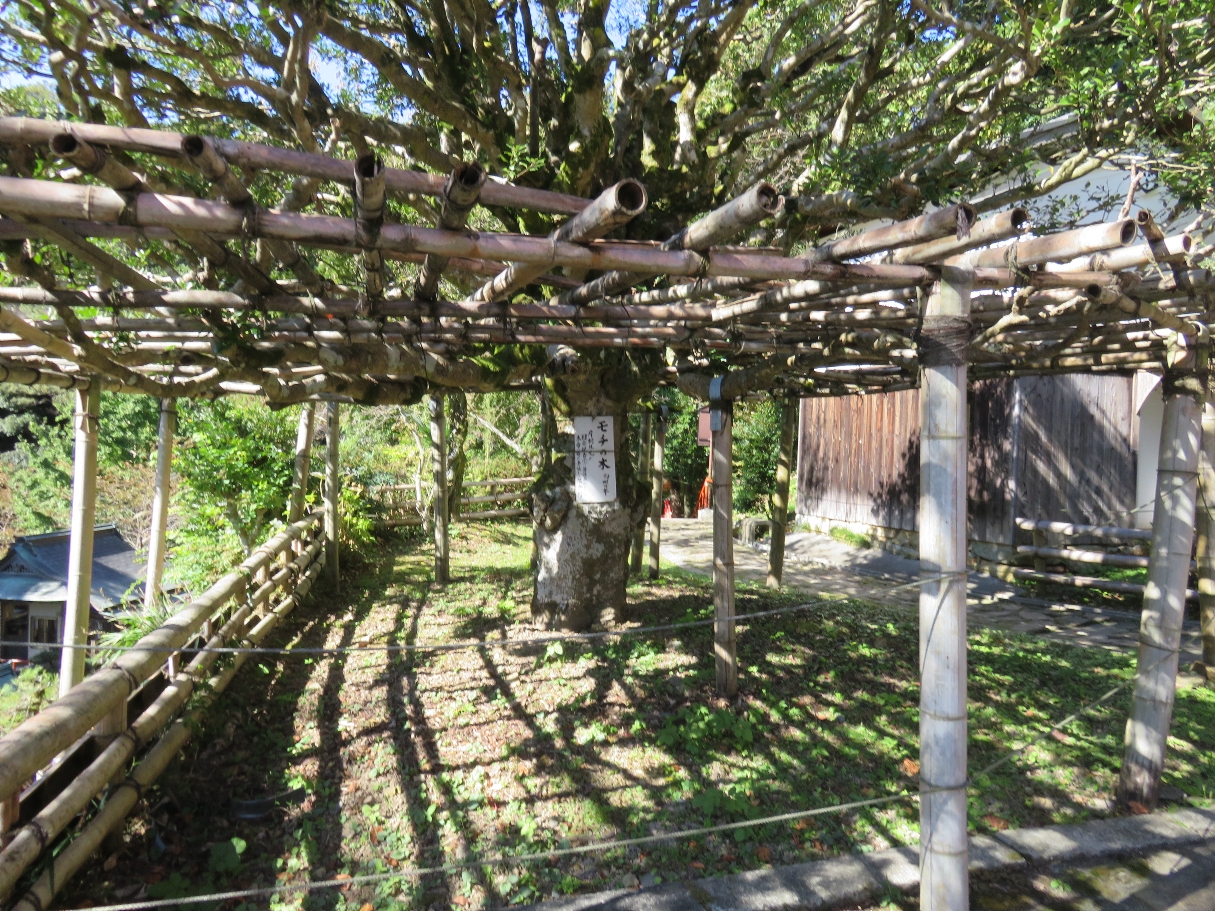 竹生島のモチの木・・・三重塔のすぐそばにある「もちの木」は、1602年(慶長7年)、観音堂、唐門、渡廊下を移築した際の記念として、豊臣秀頼の後見役である片桐且元が手植えしたものです。(2022/10/25) |