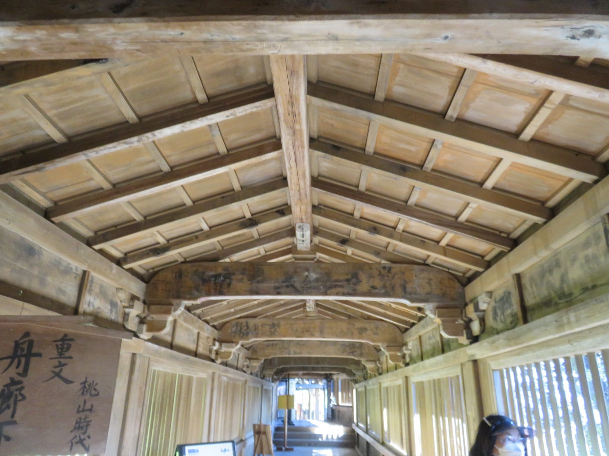 竹生島の船廊下(秀吉の御座船「日本丸」の骨組みを天井に利用している)・・・宝厳寺観音堂と都久夫須麻神社本殿は渡り廊下で直接連絡しており、両者はもともと不可分の関係にあることがわかる。(2022/10/25) |