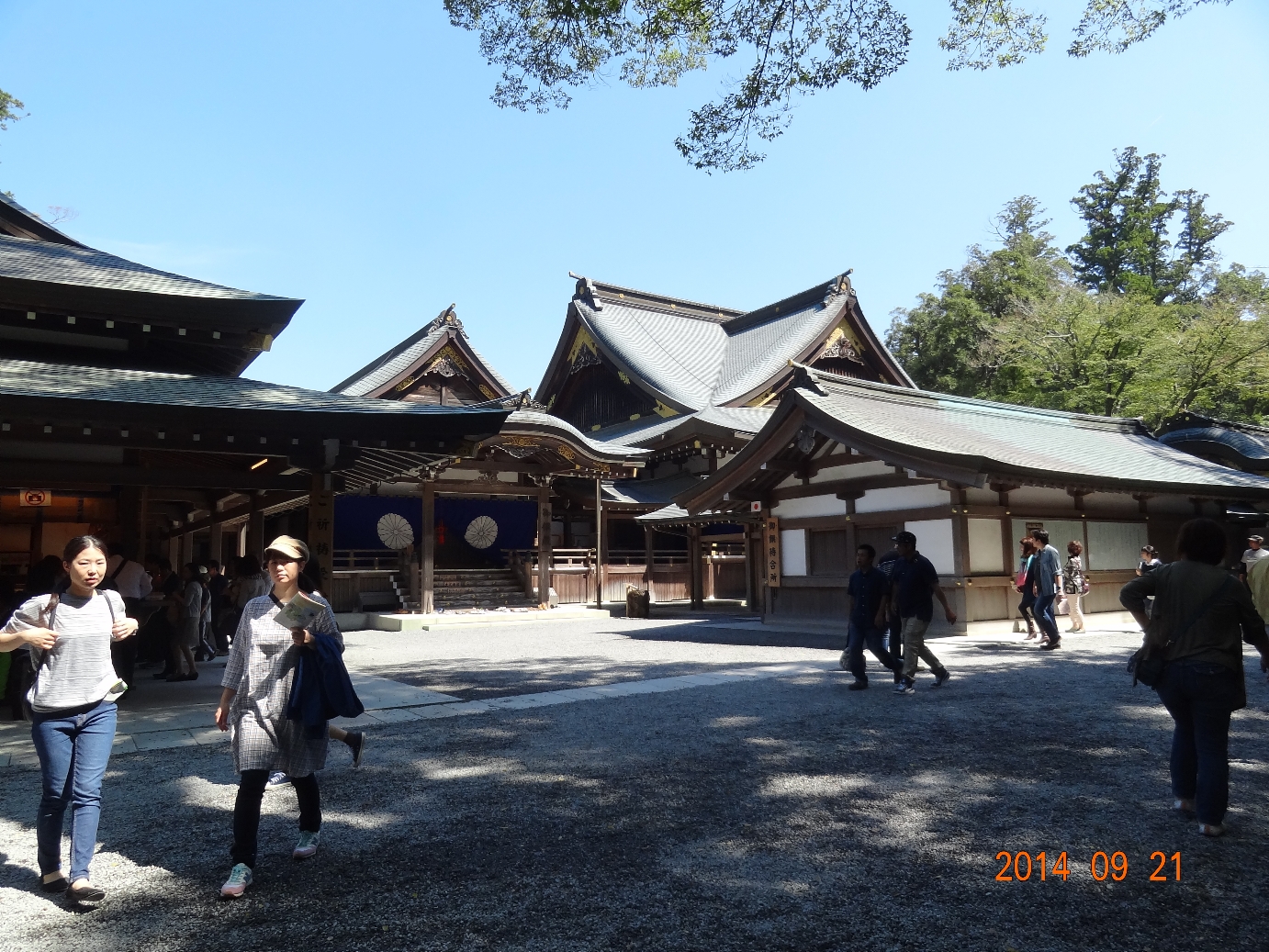 伊勢神宮の内宮の左の御札等の販売所と真ん中の御饌殿と右の神楽殿(2014/9/21) |