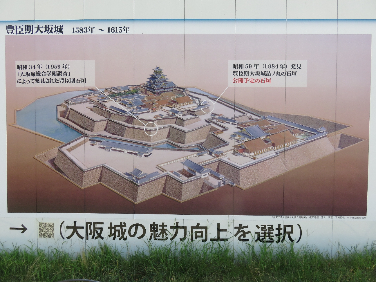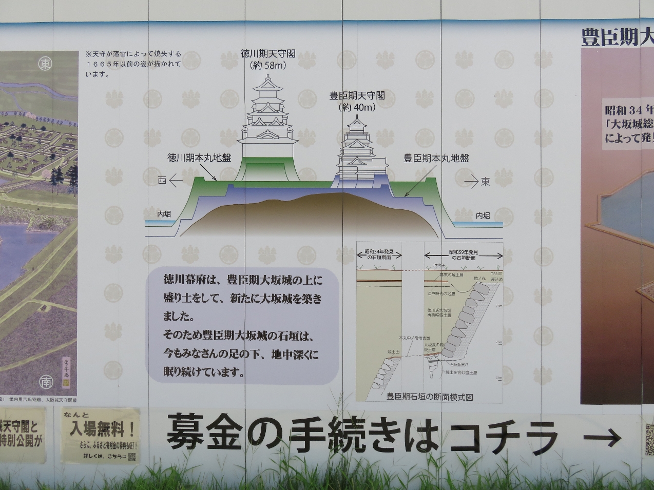 ●大阪城(正しくは大坂城)・・・「大坂夏の陣」で廃墟同然となった大坂城(豊臣大坂城)は、1620年(元和6年)に徳川秀忠の命により天下普請によって10年かけて再築されました。豊臣時代の大坂城の跡に高さ数メートルの盛り土をして再建されたため、現在も地下深くに豊臣時代の石垣が埋まっています。現在ある天守は1931年(昭和6年)に復興されたものですが、櫓や門などは江戸時代のものが残っています。