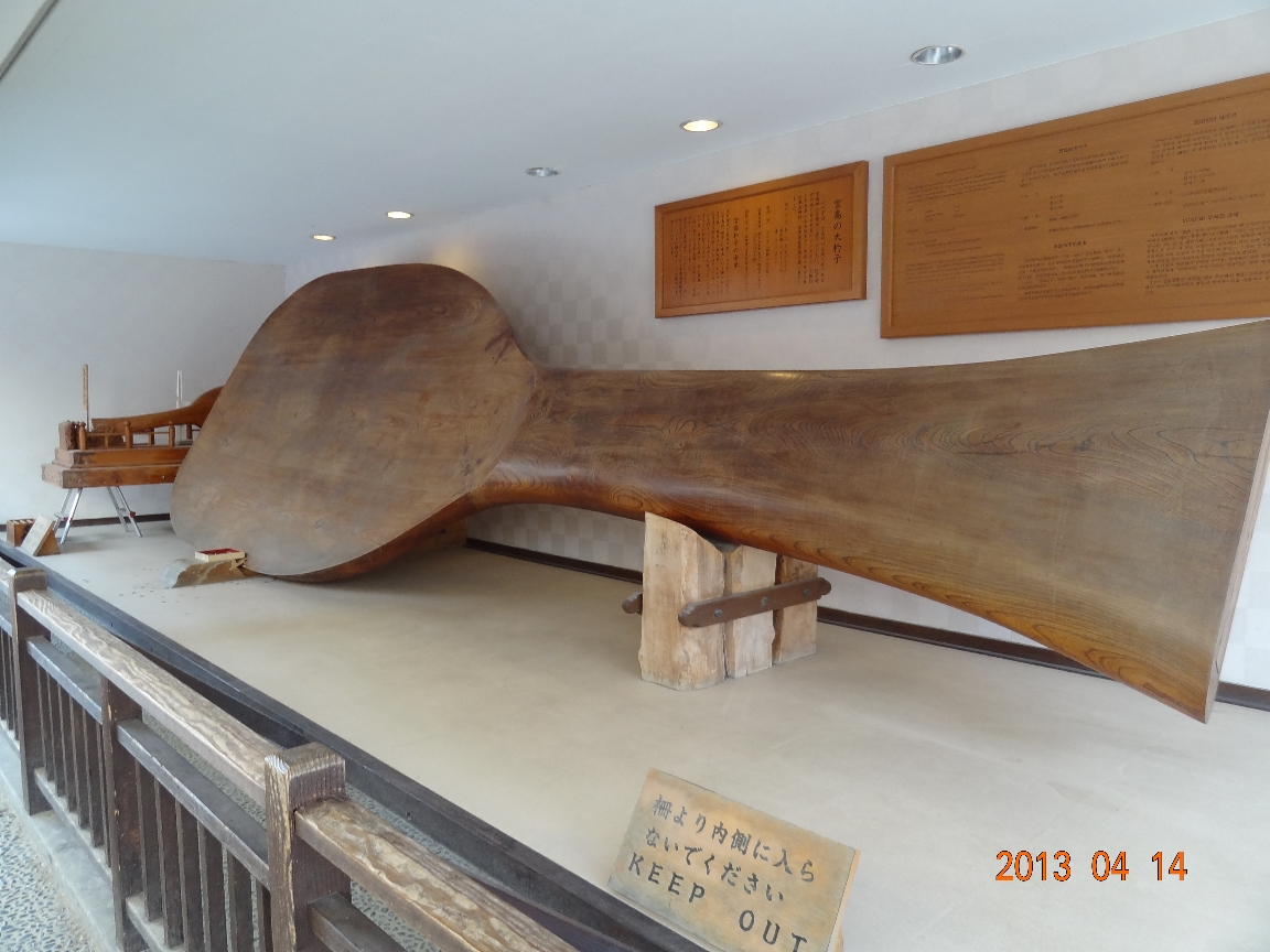 宮島の世界一の大杓子。伝統工芸である宮島細工を後世に遺すとともに、杓子発祥の地である宮島のシンボルとして制作された。長さ:7.7m。最大幅:2.7m。重さ:2.5t。材質はケヤキ(樹齢270年・長さ13m)。(2013/4/14) |