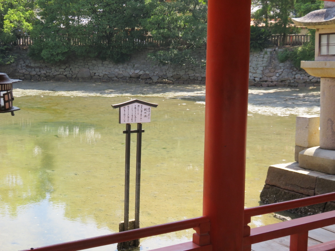 厳島神社の鏡の池・・・清水が湧きだしており、潮が引くと手鏡のように見えることからこう呼ばれる(2024/8/3) |