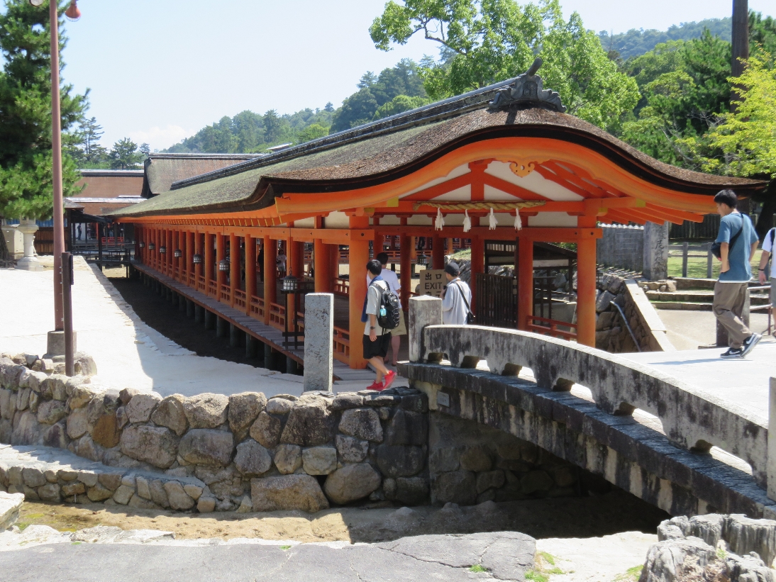 厳島神社の出口の回廊と手前の御手洗川の石橋(2024/8/3) |