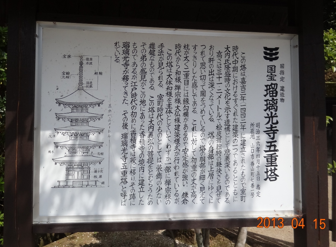 瑠璃光寺の国宝の五重塔の説明版(2013/4/15) |