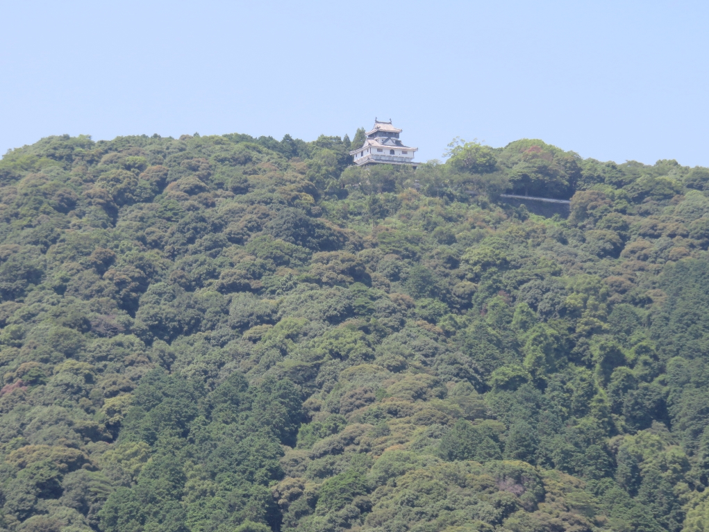 錦帯橋の橋の上から岩国城の様子をズームして撮る(2024/8/3) |