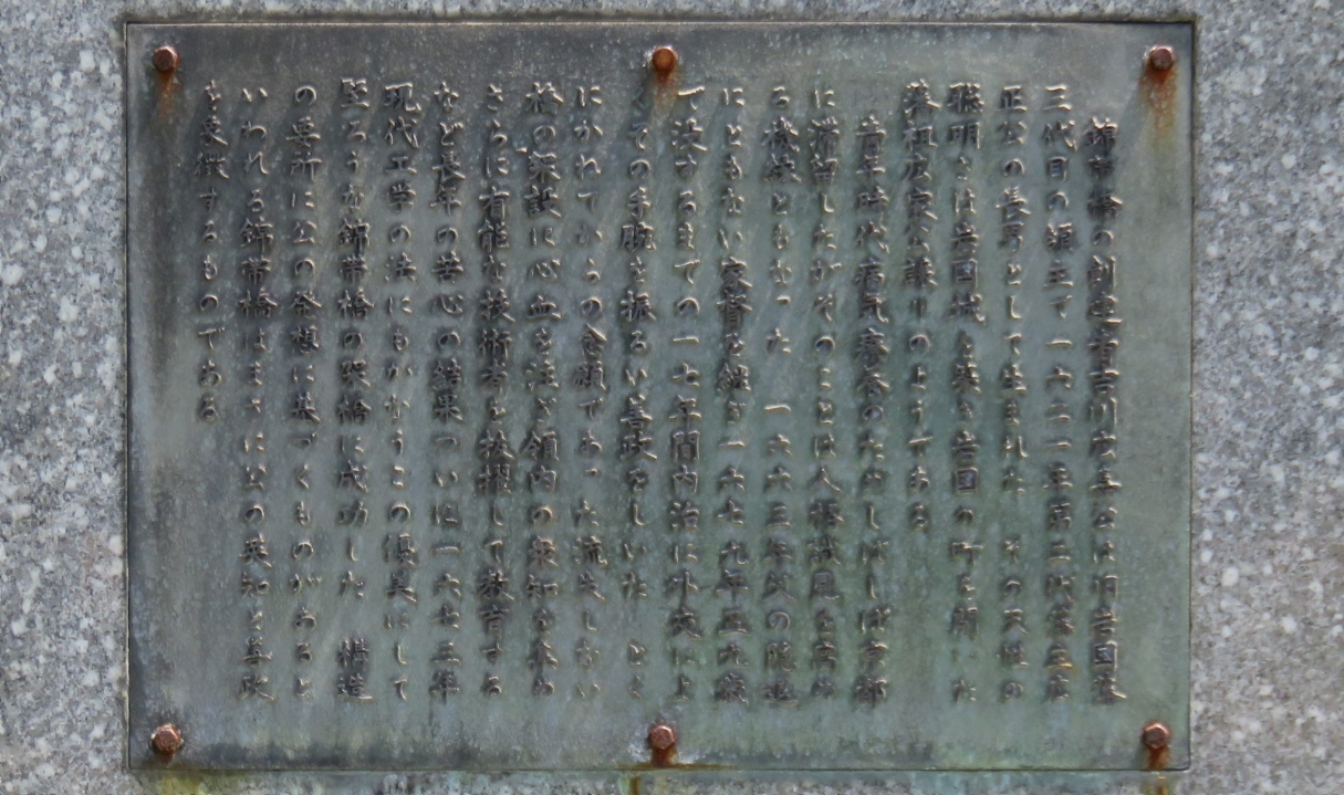 錦帯橋を渡り岩国城側の旧吉川広嘉公の銅像の裏の説明版(2024/8/3) |