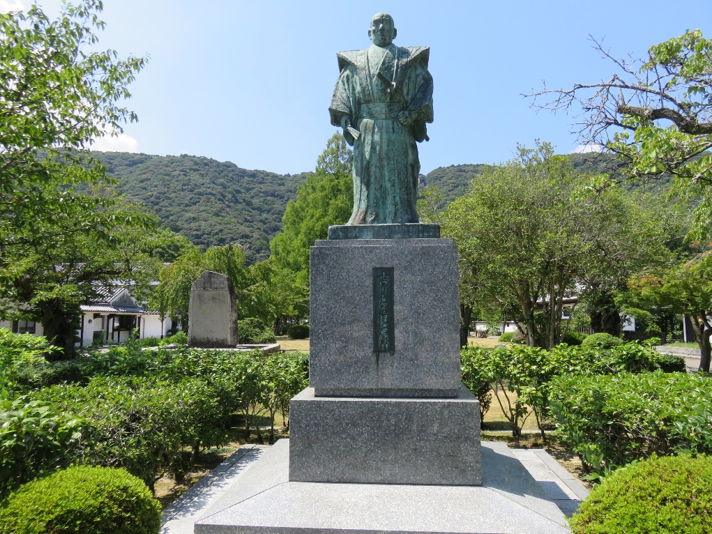 錦帯橋を渡り岩国城側の旧吉川広嘉公の銅像(2024/8/3) |