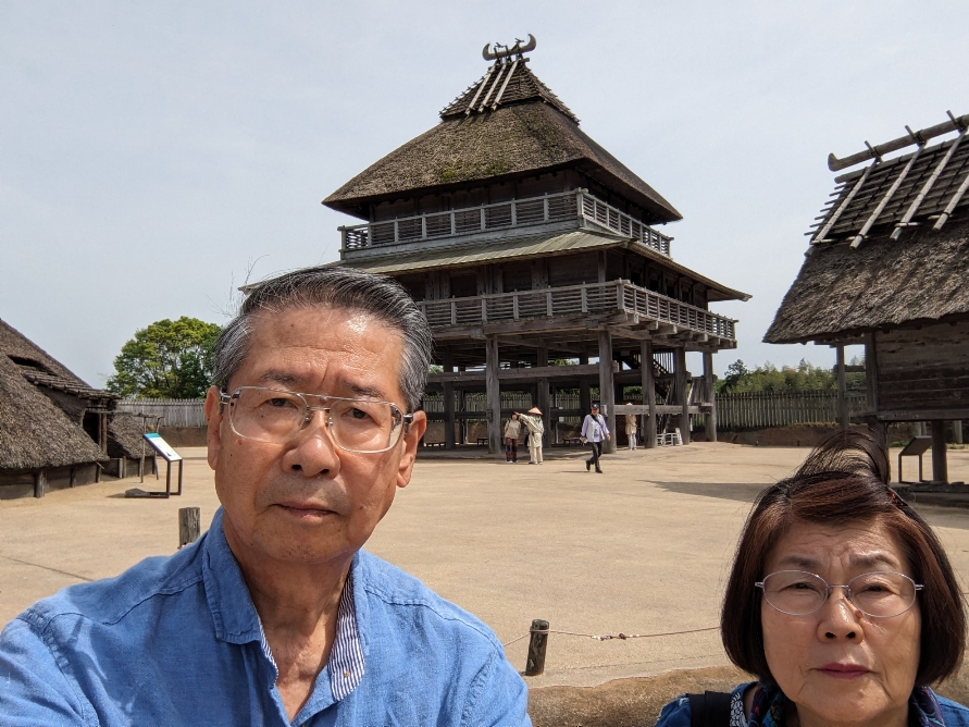 吉野ヶ里歴史公園の柵で囲まれた北内郭の内で記念撮影(2024/4/17) |