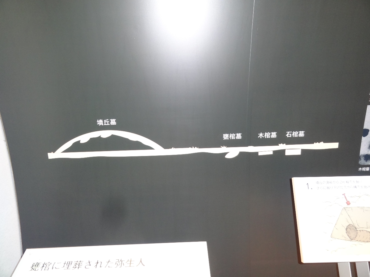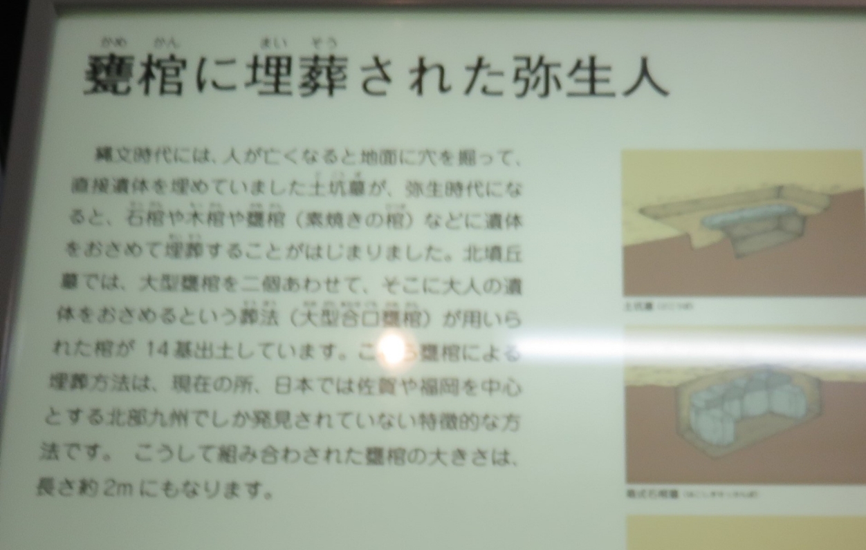 | 吉野ヶ里歴史公園の北墳丘墓の中の展示スペースの中にある北墳丘墓の中の甕棺の埋葬方法の説明版(2024/4/17) |