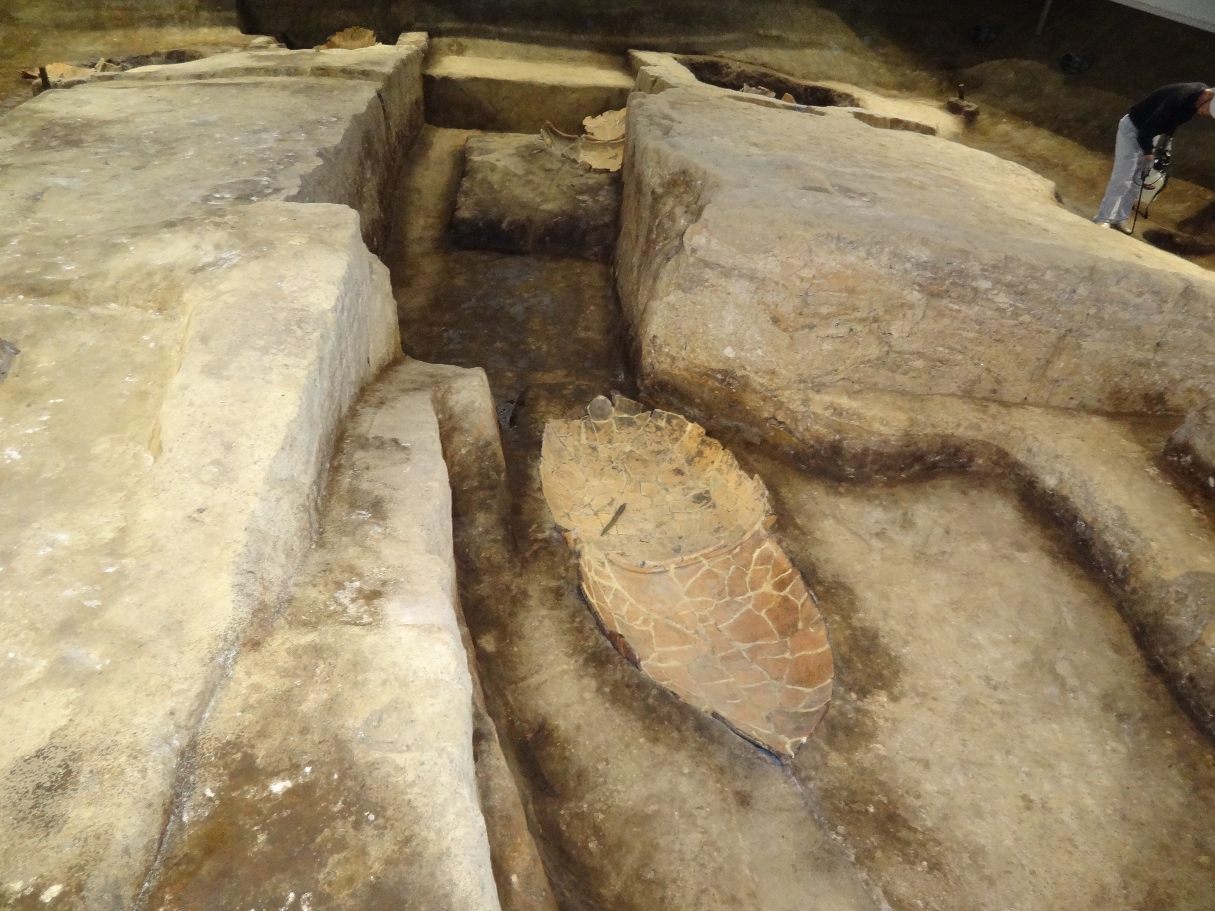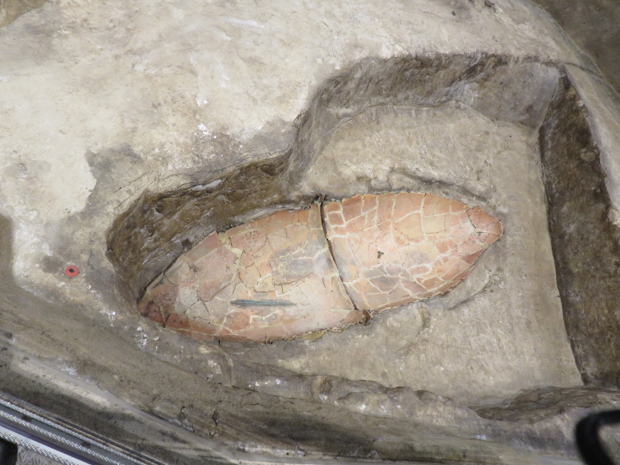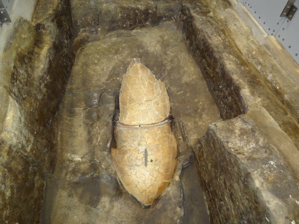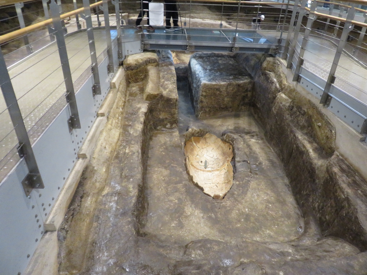 | 吉野ヶ里歴史公園の北墳丘墓の中の展示スペースの中にある北墳丘墓の中の実物の甕棺の発掘状況(2024/4/17) |