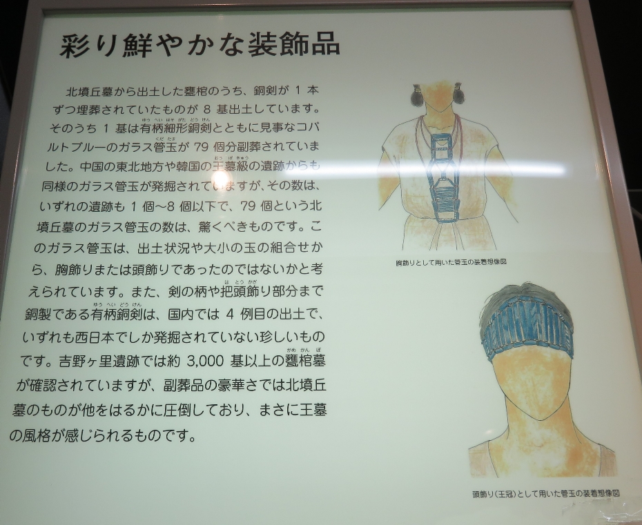 | 吉野ヶ里歴史公園の北墳丘墓の中の展示スペースの中にある北墳丘墓の中の死者の装身具の装飾状況の説明版(2024/4/17) |