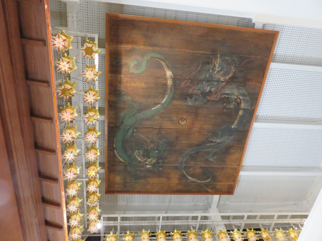 山鹿市の山鹿灯籠民芸館の二階の山鹿灯籠のたくさんの作品と、江戸時代、現在の「さくら湯」がある場所には、山鹿御茶屋という肥後細川藩の休泊所があり、お殿様専用の御前湯がありました。その天井絵とされる江戸時代に描かれた「双龍の絵」が飾られております。(2024/4/16) |