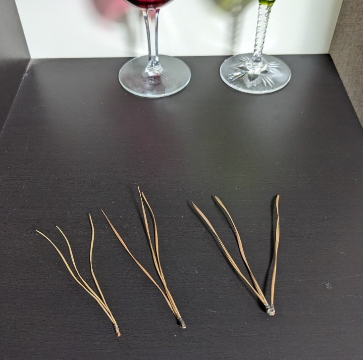 甲府市の武田神社の奇木の三葉の松の木の松葉を自宅で撮った写真(2024/1/15) |
